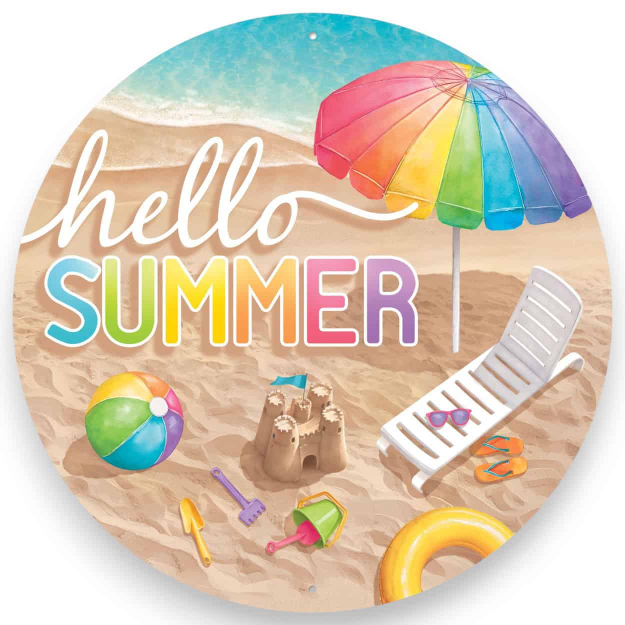 Decorate with this Summer Beach Round Sign! The fun sign features the text “Hello Summer”. The design makes you want to head right to the beach for a peacefull day of sun and bulding sandcastles. The 12″ lightweight sign is made of weather resistant aluminum and includes a predrilled hole at 12 and 6 o’clock for easy mounting. Just perfect for your Summer wreaths and home decor!