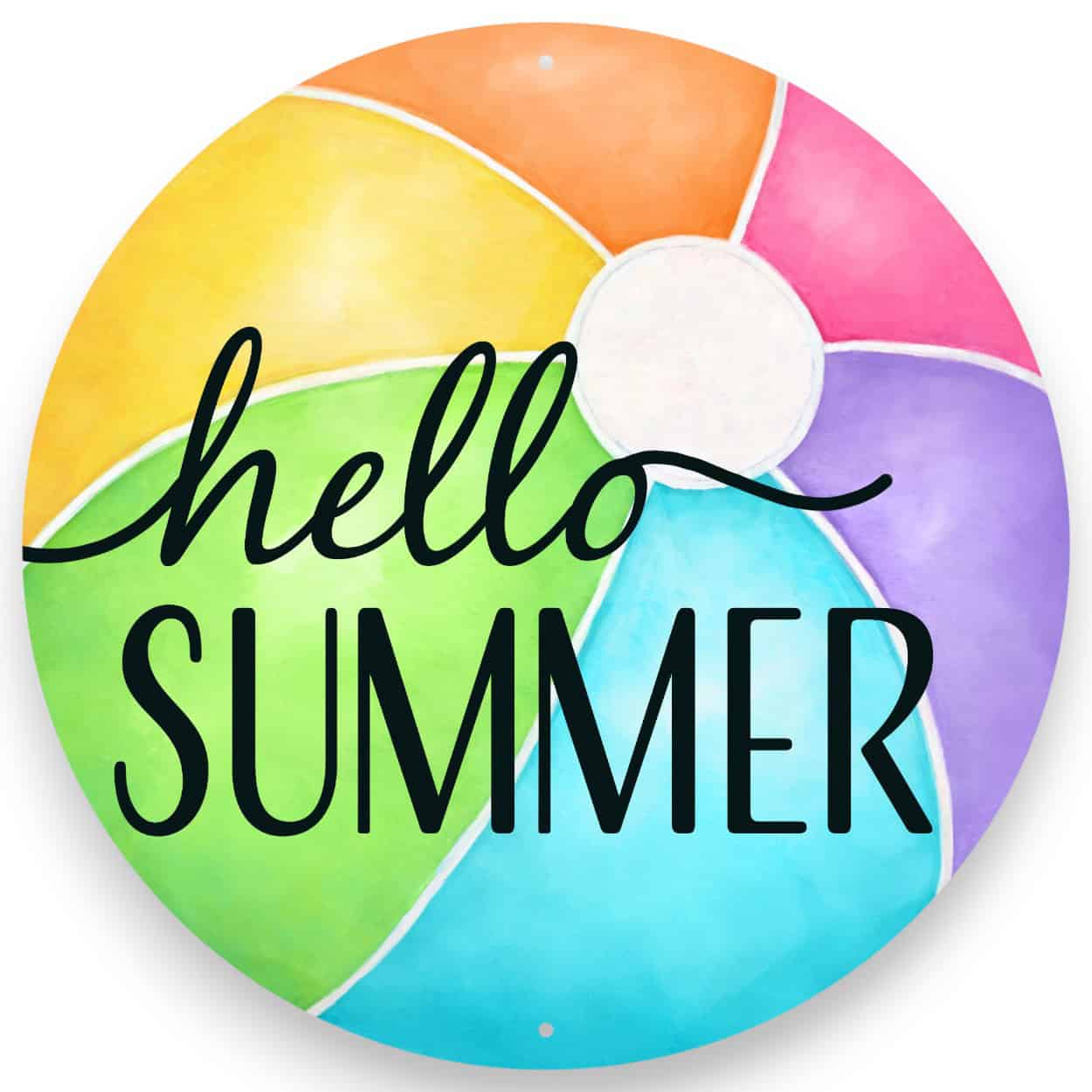Decorate with this Summer Beachball Round Sign! The cute sign features the text “Hello Summer”. The design looks like one of those inflatable beach balls and makes you want to head right to the beach for a day of fun and sun. The 12″ lightweight sign is made of weather resistant aluminum and includes a predrilled hole at 12 and 6 o’clock for easy mounting. Just perfect for your Summer wreaths and home decor!