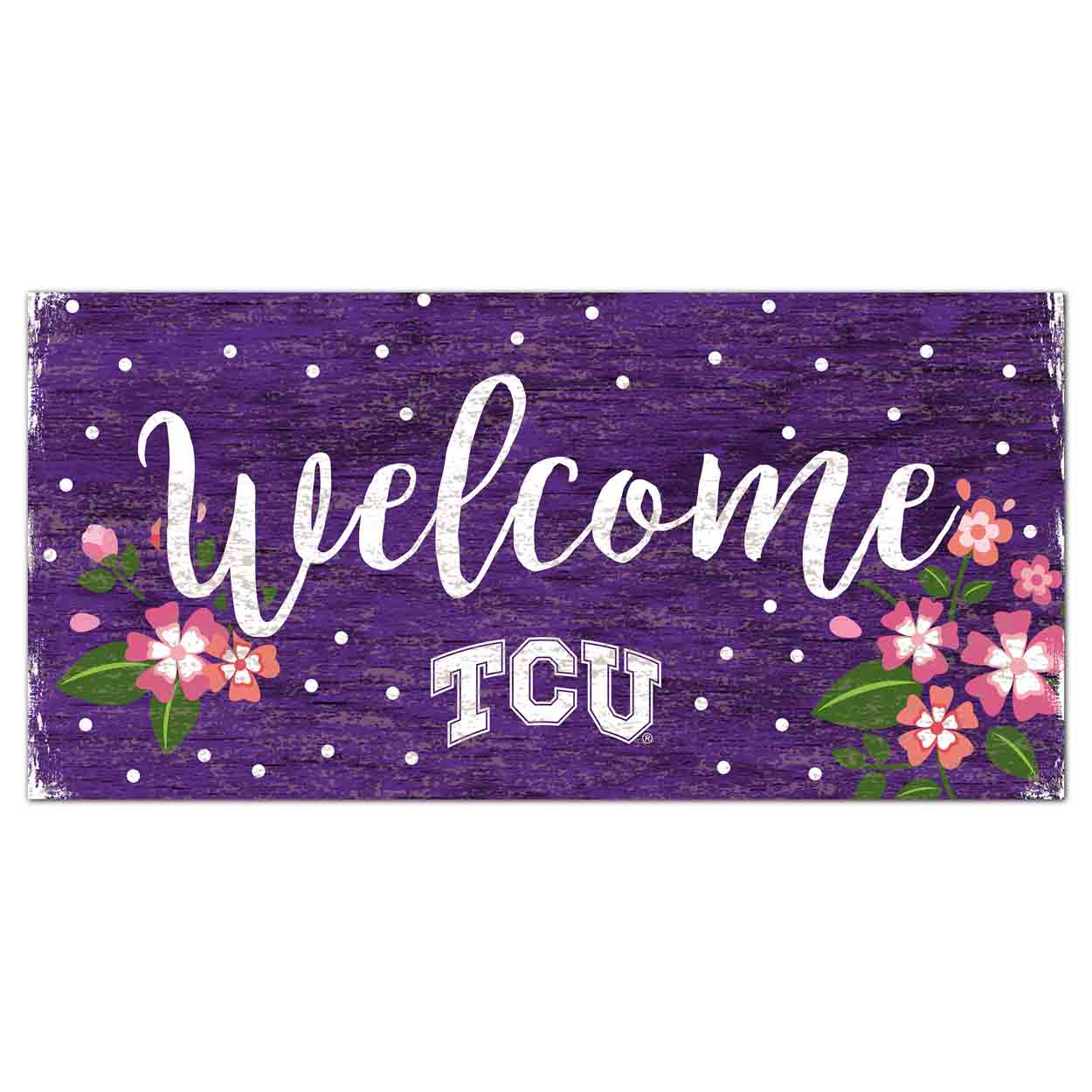 Show your spirit with this officially licensed NCAA TCU Flowers Sign—a pretty, game-day-ready accent for wreaths and home decor. Featuring the school logo and colors plus the script text “Welcome”, this design is finished with color-coordinating flowers, white polka dots, and a rustic distressed wood look. The image is printed directly on MDF, and the sign includes an attached twine hanger for easy display. Made in the USA, this TCU Flowers Sign measures 12″ x 6″ x .25″. Use it as a wreath accent sign, front door or wall decor, or a thoughtful fan gift.