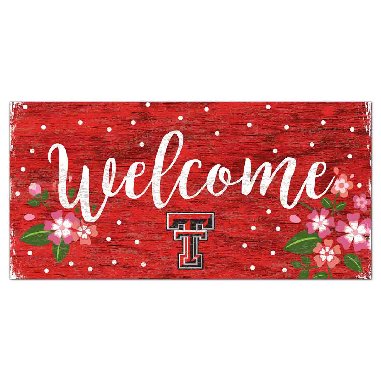 Show your spirit with this officially licensed NCAA Texas Tech Flowers Sign! Our sign is decorated with the school logo and colors, along with the script text “Welcome”. This beautiful sign is decorated with color-coordinating flowers and white polka dots. It is a distressed design to mimic the look of rustic wood. The image is printed directly onto MDF wood and the sign includes an attached twine hanger. This Texas Tech Flowers Sign is made in the USA and measures 12″ x 6″ x .25″. The sign can be used as a wreath accent sign, home decor or a gift for that special fan.