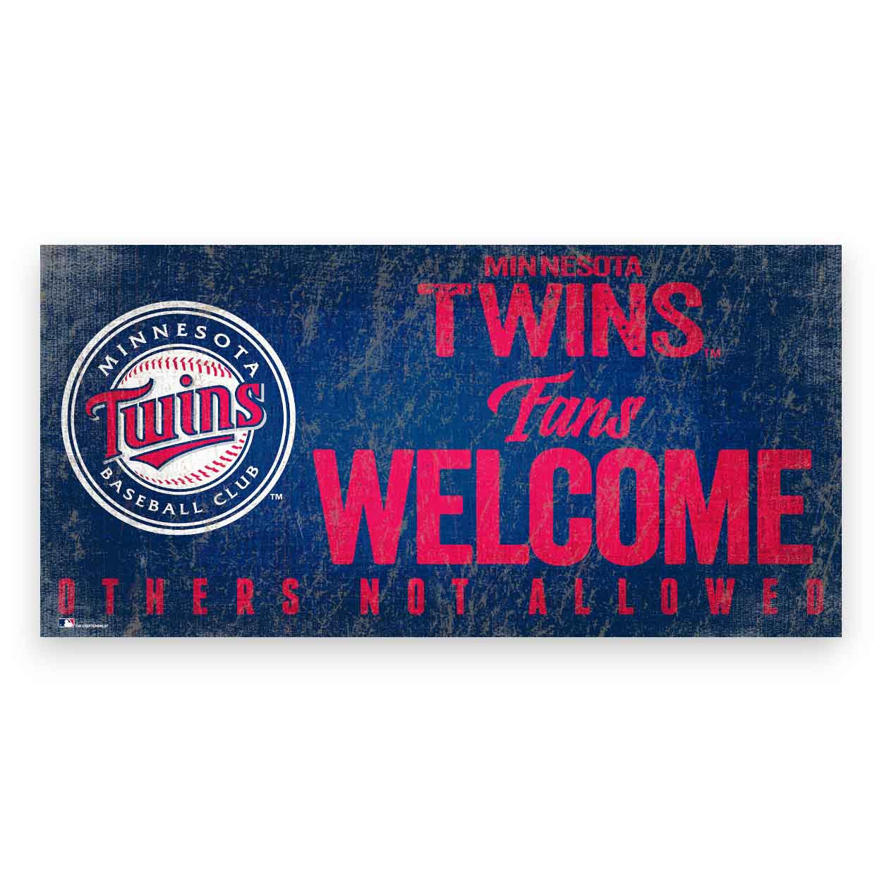 Show your spirit with this officially licensed MLB Twins Fans Welcome Sign! Our sign is decorated with the team name, logo, colors and text “Fans Welcome, Others Not Allowed”. It is a distressed design to mimic the look of rustic wood. The image is printed directly on the sign base, made of MDF wood – this is not a printed paper decal. This sign is made in the USA and measures 12″ x 6″ x .25″ and includes an attached rope hanger. The Twins Fans Welcome Sign can be used as a wreath accent sign, home decor or a gift for that special fan.FAQs