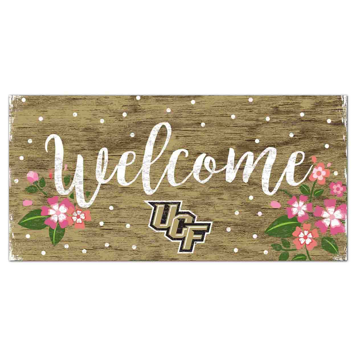 Show your spirit with this officially licensed NCAA UCF Knights Flowers Sign! Our sign is decorated with the school logo and colors, along with the script text “Welcome”. This beautiful sign is decorated with color-coordinating flowers and white polka dots. It is a distressed design to mimic the look of rustic wood. The image is printed directly onto MDF wood and the sign includes an attached twine hanger. This UCF Knights Flowers Sign is made in the USA and measures 12″ x 6″ x .25″. The sign can be used as a wreath accent sign, home decor or a gift for that special fan.