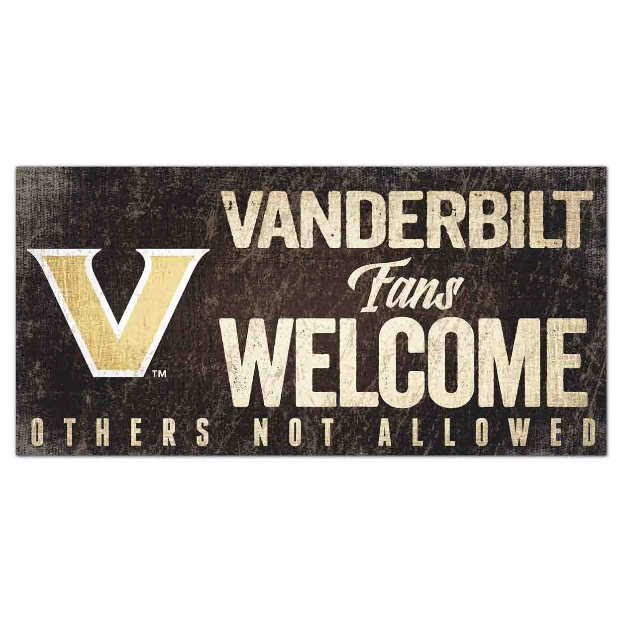 Show your spirit with this officially licensed NCAA Vanderbilt Fans Welcome Sign! Our sign is decorated with the school name, logo, colors and text “Fans Welcome, Others Not Allowed”. It is a distressed design to mimic the look of rustic wood. The image is printed directly on the sign base, made of MDF wood – this is not a printed paper decal. This sign is made in the USA and measures 12″ x 6″ x .25″ and includes an attached rope hanger. The Vanderbilt Fans Welcome Sign can be used as a wreath accent sign, home decor or a gift for that special fan.FAQs