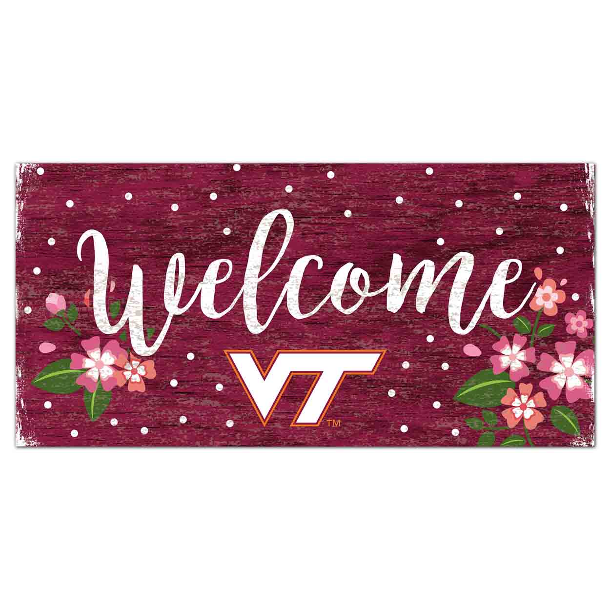 Show your spirit with this officially licensed NCAA Virginia Tech Flowers Sign! Our sign is decorated with the school logo and colors, along with the script text “Welcome”. This beautiful sign is decorated with color-coordinating flowers and white polka dots. It is a distressed design to mimic the look of rustic wood. The image is printed directly onto MDF wood and the sign includes an attached twine hanger. This Virginia Tech Flowers Sign is made in the USA and measures 12″ x 6″ x .25″. The sign can be used as a wreath accent sign, home decor or a gift for that special fan.