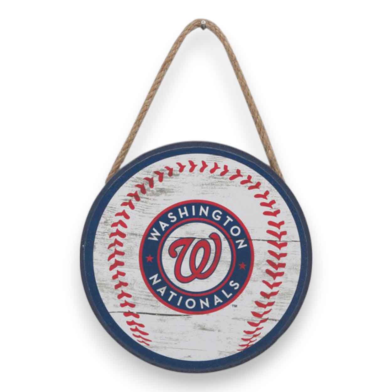 Cheer on your team with our Washington Nationals Ornament! This officially licensed MLB ornament features the team logo and colors in a distressed design. The Christmas ornament measures 4″ W X 4″ H X 0.375″ D and is made in the USA. It is made of wood and features an attached twine hanger. The design shown in on the front of the ornament, while the back of the ornament is plain wood. This Washington Nationals Baseball Ornament is perfect for wreaths, Christmas trees, home decor and gifts for that special MLB Nationals fan.FAQs