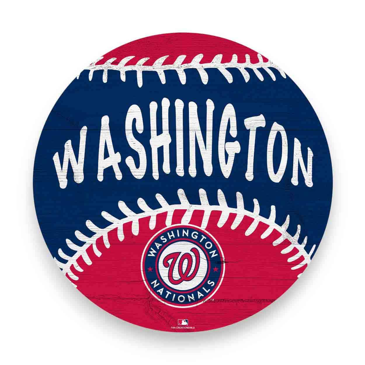 Our Washington Nationals Baseball Sign features a baseball decorated with the team colors, name and logo. This officially licensed MLB Washington Nationals Baseball Sign measures 12″ diameter and is .25 inches thick. This is a distressed design and the images are printed directly onto MDF wood. The sign is made in the USA and includes an attached saw-tooth hanger. The sign can be used as a wreath sign, home decor, party decor or a gift for that special baseball fan.FAQs