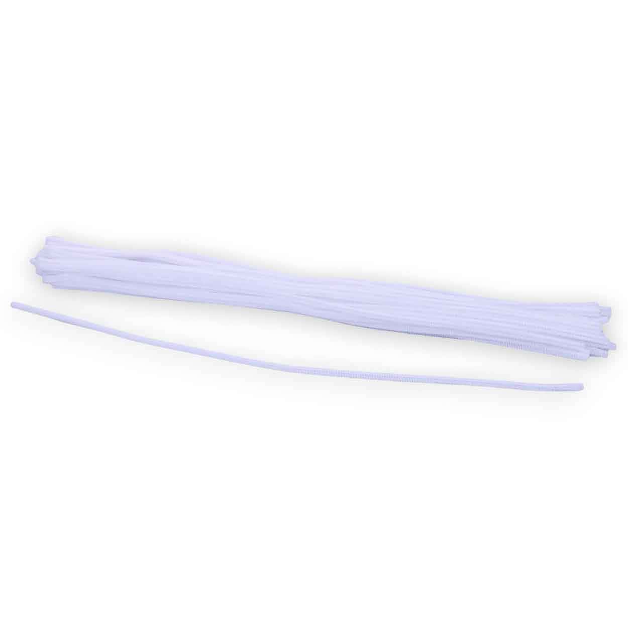 White pipe cleaners for wreath making and craft projects. This is a package of 50 wired chenille pipe cleaners that measure 20″ long x 6mm wide.
