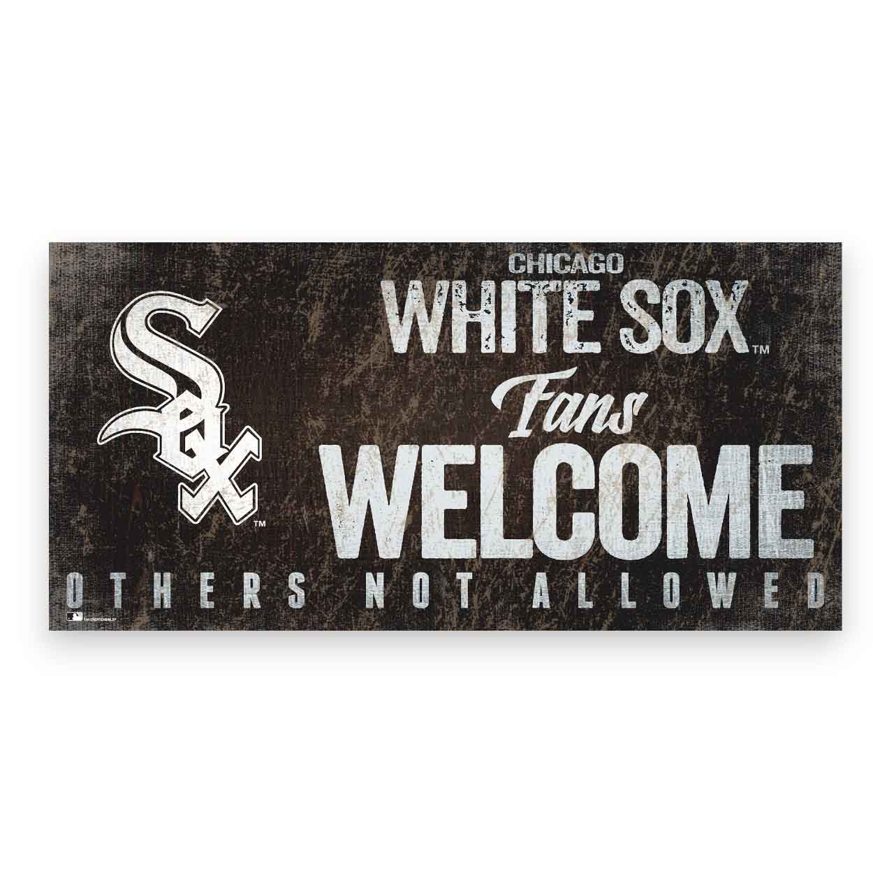 Show your spirit with this officially licensed MLB White Sox Fans Welcome Sign! Our sign is decorated with the team name, logo, colors and text “Fans Welcome, Others Not Allowed”. It is a distressed design to mimic the look of rustic wood. The image is printed directly on the sign base, made of MDF wood – this is not a printed paper decal. This sign is made in the USA and measures 12″ x 6″ x .25″ and includes an attached rope hanger. The White Sox Fans Welcome Sign can be used as a wreath accent sign, home decor or a gift for that special fan.FAQs