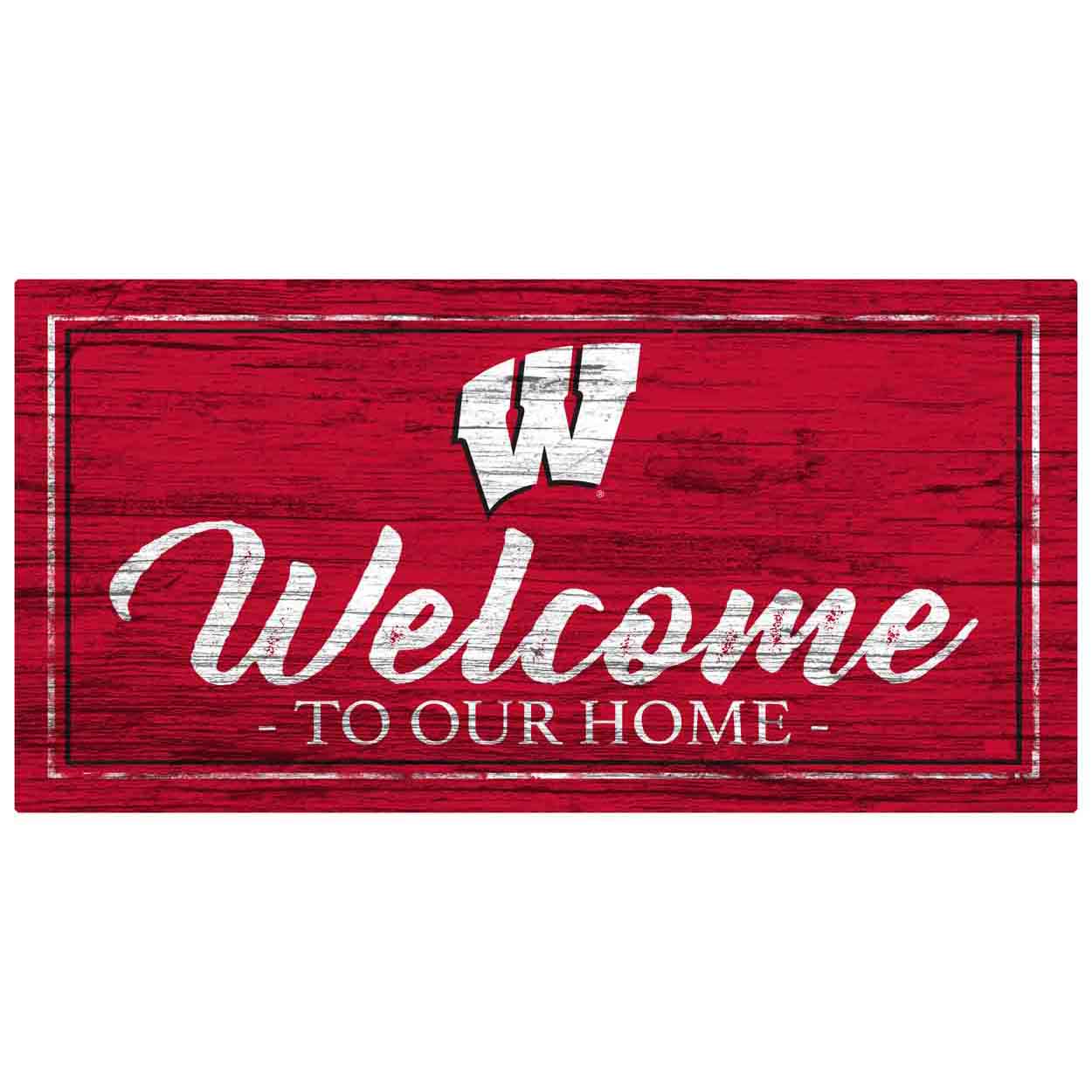 Show your spirit with this officially licensed Wisconsin Badgers Home Sign! This sign is perfect as a wreath accent, a front door decor piece, man cave decoration, or a fan gift. It has a rustic distressed wood look and features the text “Welcome to our Home”, printed directly on MDF. The sign measures 12″ long x 6″ high and includes an attached twine hanger.
